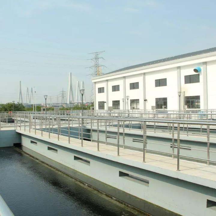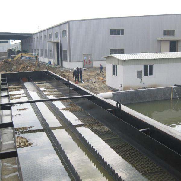 絮凝后出水进入沉淀池的斜板底部然后上向流至上部集水区,?颗粒和絮体沉淀在斜板的表面上并在重力作用下下滑。较高的上升流速和斜板?60°倾斜可以形成一个连续自刮的过程,使絮体不会积累在斜板上。污泥沿斜板表面下滑并沉淀在沉淀池底部,?然后循环泵把部分污泥输送到混凝和絮凝池中,剩余污泥通过重力流流向污泥处理系统。沉淀后的水由分布在斜板沉淀池顶部的不锈钢集水槽收集、排放。?